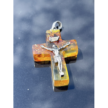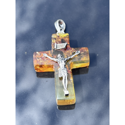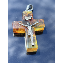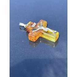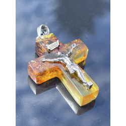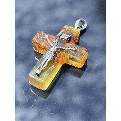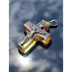 Krzyżyk wisiorek z naturalnego bursztynu bałtyckiego ozdobiony srebrną pasyjką (925)