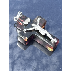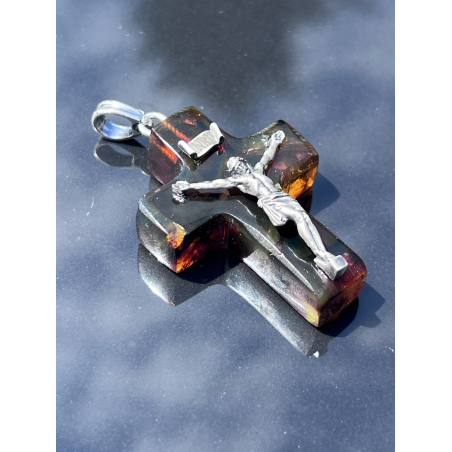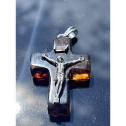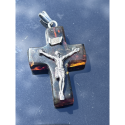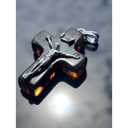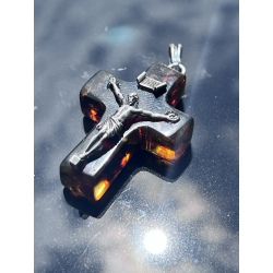 Krzyżyk wisiorek z naturalnego bursztynu bałtyckiego ozdobiony srebrną pasyjką (925)