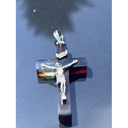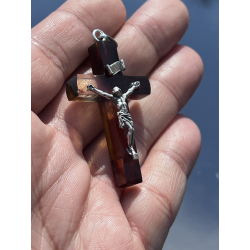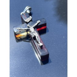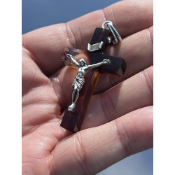 Krzyżyk wisiorek z naturalnego bursztynu sumatrzańskiego ozdobiony srebrną pasyjką (925)