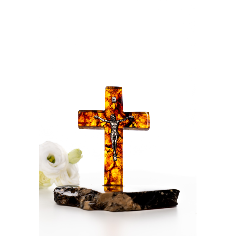 Ten wyjątkowy krzyż z bursztynu bałtyckiego łączy naturalne piękno z duchowym przesłaniem. Wykonany z prasowanego bursztynu bałtyckiego, krzyż posiada pasję Jezusa Chrystusa w formie metalowej figurki wykutej z nierdzewnej stali, wykonanej we Włoszech. Precyzyjnie odwzorowana scena męki Chrystusa nadaje temu dziełu głęboki, duchowy wymiar i stanowi ważny element każdej przestrzeni modlitewnej.