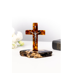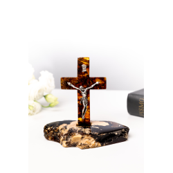 Krzyż spoczywa na stabilnej podstawie wykonanej z naturalnego bursztynu sumatrzańskiego, co dodaje mu elegancji i unikalnego charakteru. Jego wymiary to około 13 cm x 8 cm (5,12 cala x 3,15 cala), co sprawia, że jest idealnym rozmiarem do wyeksponowania na ołtarzu, półce lub w miejscu modlitwy. Ten krzyż wolnostojący to piękna przypomnienie o męce Chrystusa, symbol wiary i miłości, który wprowadza do wnętrza atmosferę spokoju i refleksji.