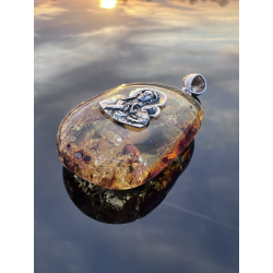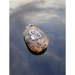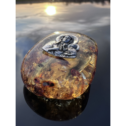 Ten wyjątkowy medalion został wykonany z naturalnego, matowego bursztynu o wymiarach 5 cm × 3 cm i grubości ok. 1,5 cm, tworząc solidną i piękną oprawę duchowej pamiątki. W centrum znajduje się misternie wykonany srebrny medalik Matki Boskiej Częstochowskiej o wymiarach 2 cm × 1,5 cm i wadze 5 g, który symbolizuje opiekę, wiarę i duchowe światło w codziennym życiu. Całość waży ok. 18,5 g, a ręczne wykonanie nadaje każdemu egzemplarzowi niepowtarzalny charakter.