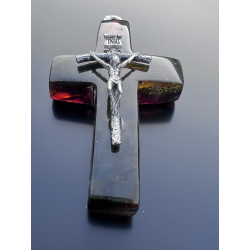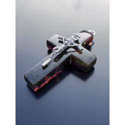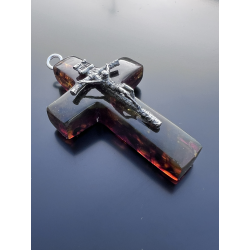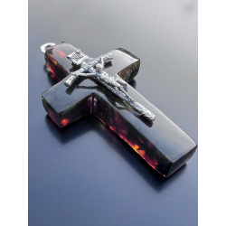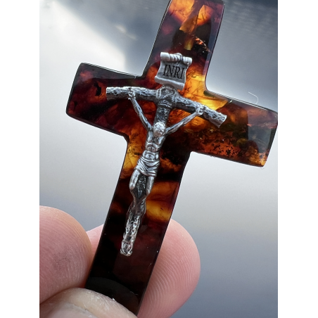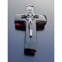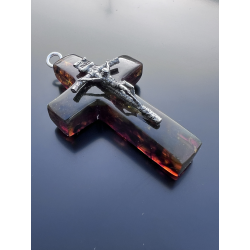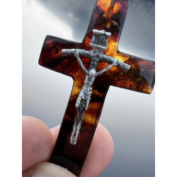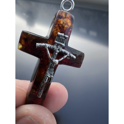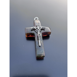 Krzyżyk wisiorek z naturalnego bursztynu bałtyckiego ozdobiony srebrną pasyjką (925)