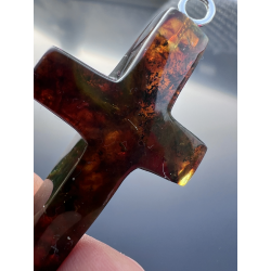 Ten niezwykły krzyżyk z naturalnego bursztynu bałtyckiego o wymiarach ok. 4 cm x 3 cm, grubość ok 7mm, długość bez  uszka, (1.77 x 1.26 cala)  stanowi nie tylko elegancki element biżuterii, ale również głęboki symbol duchowy. Bursztyn, znany ze swoich właściwości ochronnych, w połączeniu z delikatną pasyjką Pana Jezusa Chrystusa wykonaną z najwyższej próby srebra (925), tworzy unikatowy wisiorek o szczególnym mistycznym charakterze.
