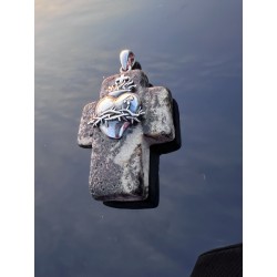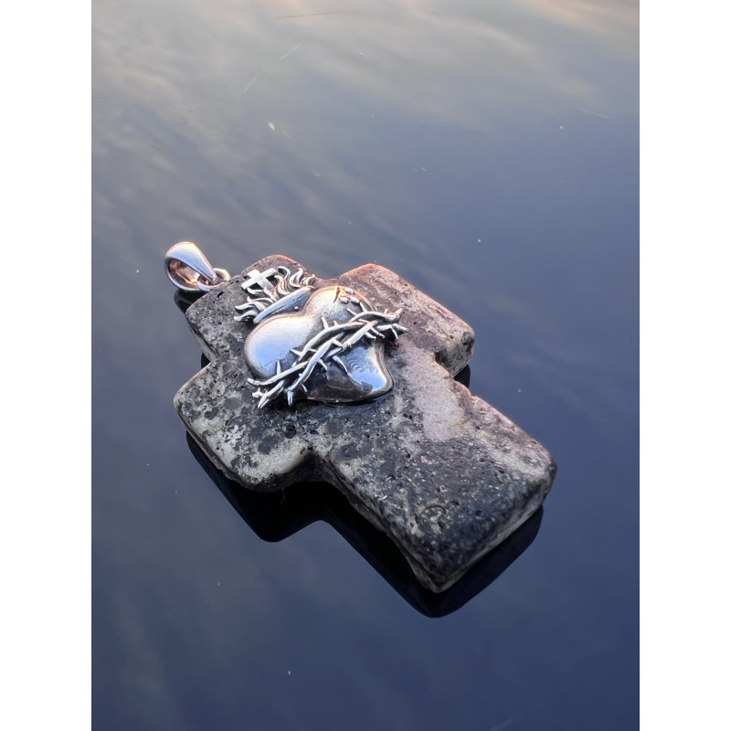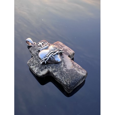 Centralnym elementem jest Serce Jezusa — ukazane w klasycznej symbolice: otoczone cierniem, zwieńczone krzyżem i płomieniem miłości. Srebro nadaje mu wyrazistości i szlachetnego blasku, który kontrastuje z surową, spokojną strukturą bursztynu.
