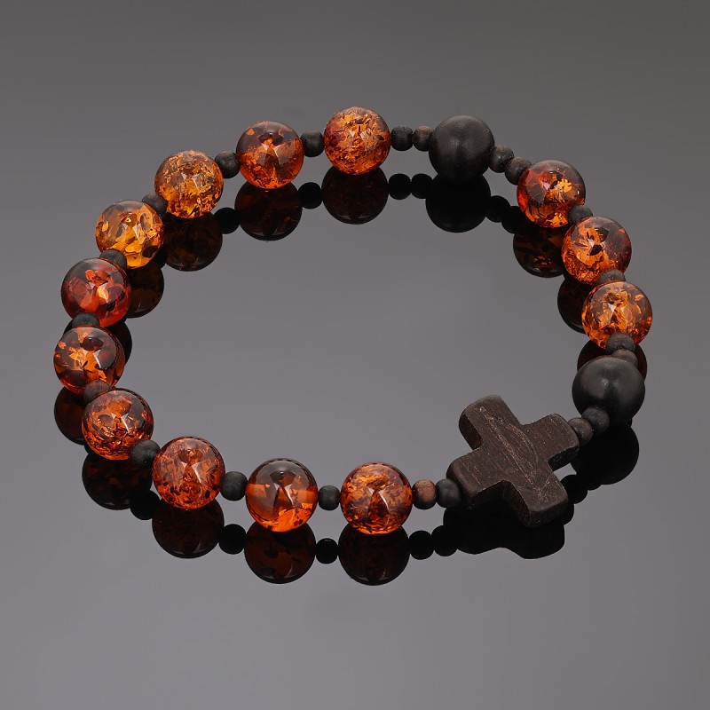 Bransoletka łączy ciepły, koniakowy odcień bursztynu z naturalną głębią drewna. Zachowuje stonowany, elegancki wygląd i jest wygodna w codziennym użytkowaniu.