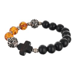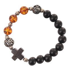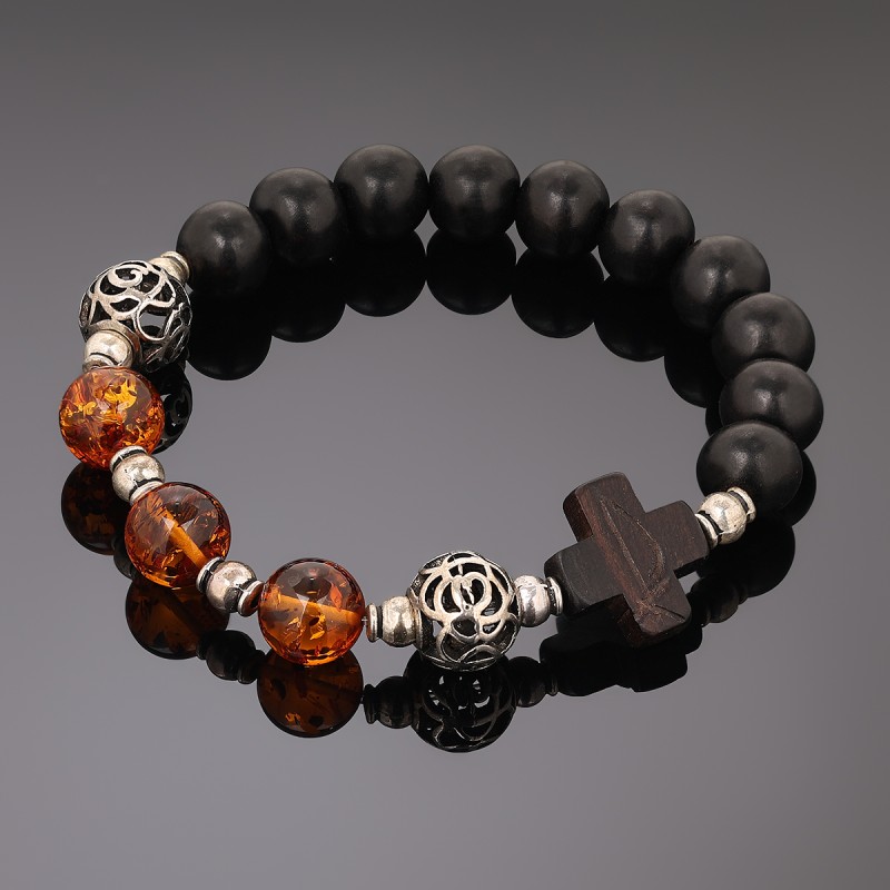 OraRosarium Bransoletka różaniec na rękę z hebanu i bursztynu koniakowego antyczne srebro