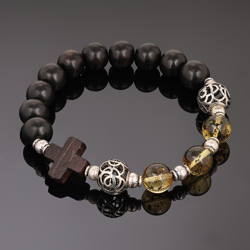 Bransoletka różaniec na rękę z hebanu i bursztynu oliwkowego antyczne srebro