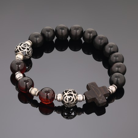 Bransoletka różaniec na rękę z hebanu i bursztynu cherry antyczne srebro