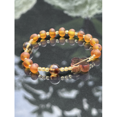Oferujemy subtelny i elegancki różaniec katolicki w formie bransoletki, wykonany z naturalnego bursztynu bałtyckiego. Koraliki o rozmiarze ok. 7-8 mm idealnie komponują się z dziesiątkami wykonanymi z kalibrowanego bursztynu bałtyckiego o średnicy ok. 8-9 mm. Całość tworzy duchową i estetyczną ozdobę, idealną do codziennego noszenia i modlitwy. Bransoletka o długości ok. 17-18 cm jest wygodna i delikatna na nadgarstku.