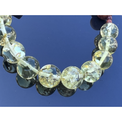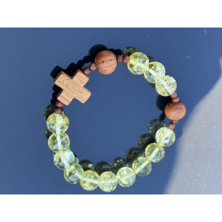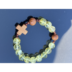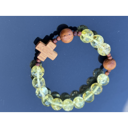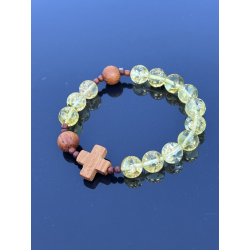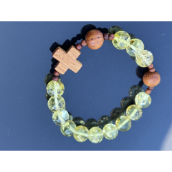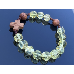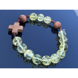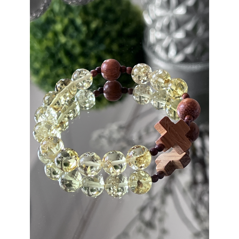 Unikalny katolicki różaniec na rękę, wykonany z naturalnego bursztynu bałtyckiego w pięknym cytrynowo-żółtym kolorze z wyjątkowymi łuskami, które podkreślają jego naturalne pochodzenie. Paciorki o wielkości 8–10 mm są delikatnie oszlifowane, dzięki czemu mają przyjemną, ciepłą fakturę. Krzyżyk i paciorki „dziesiątek” wykonane są z egzotycznego drewna Bayong, co nadaje różańcowi wyjątkowy, organiczny charakter.