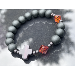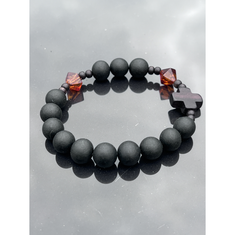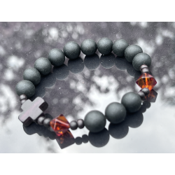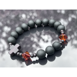 Unikalna bransoletka-różaniec wykonana ręcznie z prasowanego czarnego bursztynu (korale 10 mm) oraz naturalnego bursztynu bałtyckiego w ciepłym kolorze koniakowym (dziesiątki 9–10 mm). Ozdobiona krzyżykiem z hebanu tygrysiego o wymiarach 16x16 mm. Obwód bransoletki to około 20 cm – z możliwością indywidualnego dopasowania w zakresie 18–23 cm.