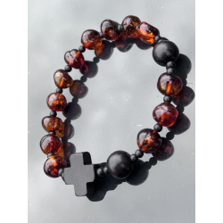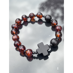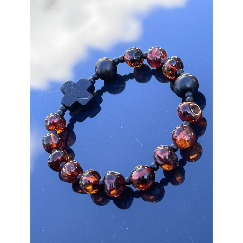 Bransoletka Różaniec z Naturalnego Bursztynu Bałtyckiego – z Krzyżykiem z Hebanu Tygrysiego