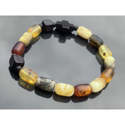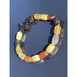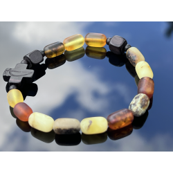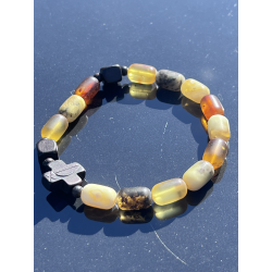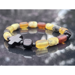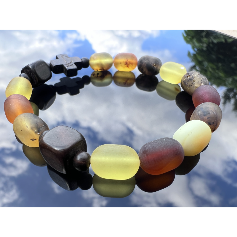 Ręcznie wykonany różaniec na rękę z naturalnego bursztynu bałtyckiego w matowym wykończeniu. Jego korale (ok. 12 mm x 8 mm) są subtelnie oszlifowane, a ich ciepły dotyk sprzyja wyciszeniu i skupieniu. Krzyżyk (ok. 16 mm x 16 mm) oraz paciorki „dziesiątek” wykonane są z egzotycznego drewna Bayong, które podkreśla naturalny charakter tego wyjątkowego różańca.