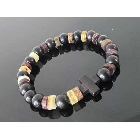 Ten wyjątkowy różaniec na rękę został wykonany z naturalnych materiałów – głębokiego, ciemnego hebanu tygrysiego oraz matowego bursztynu bałtyckiego. Połączenie tych dwóch surowców symbolizuje duchową walkę światła i ciemności – i zwycięstwo modlitwy nad zwątpieniem.