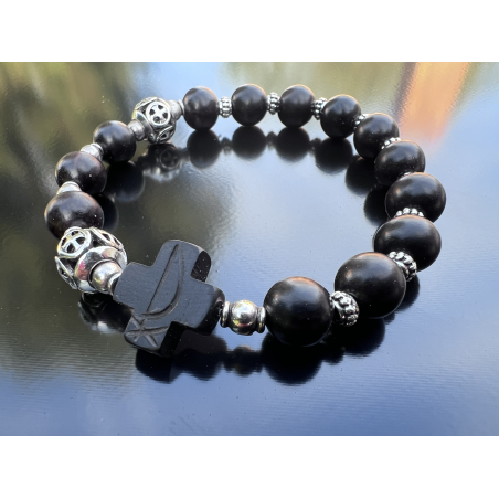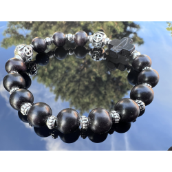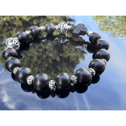 Elegancki, a zarazem mocny różaniec męski na rękę wykonany z naturalnego drewna hebanowego i ozdobnych elementów z oksydowanego metalu. Każdy koralik o średnicy 10 mm (ok. 0.39 cala) starannie dobrany, aby tworzyć klasyczną i wyważoną kompozycję, idealną na codzienną modlitwę lub jako duchowy talizman.