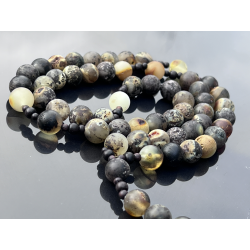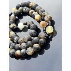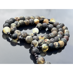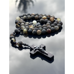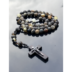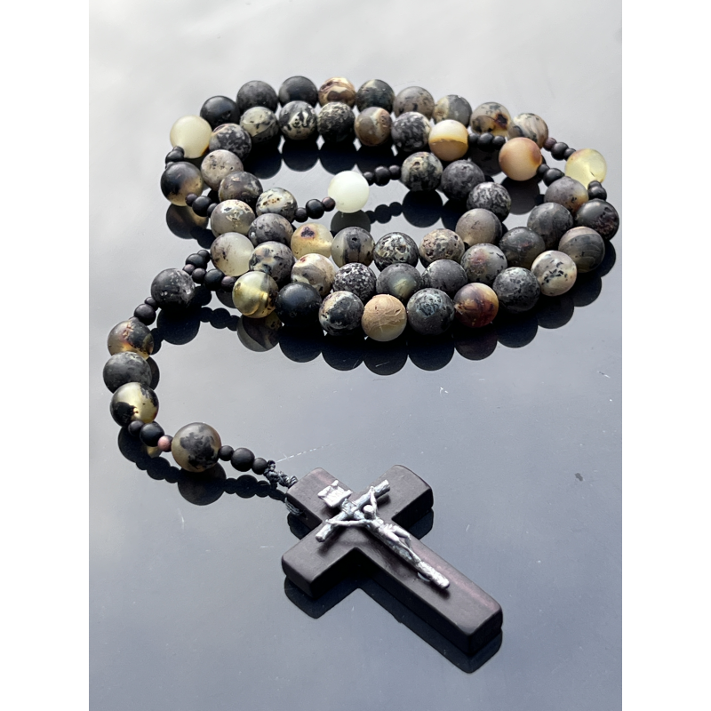 Różaniec to wyjątkowy przedmiot modlitewny, wykonany z najwyższą starannością z naturalnego bursztynu bałtyckiego w kolorze oliwkowym. Koraliki są matowe, niepolerowane, o średnicy około 8-9 mm (0,31-0,35 cala), co nadaje różańcowi naturalny i szlachetny wygląd. Długość różańca wynosi około 41 cm (16,14 cala), z obwodem około 60 cm (23,62 cala), co sprawia, że jest wygodny w użytkowaniu zarówno w czasie modlitwy, jak i noszenia.