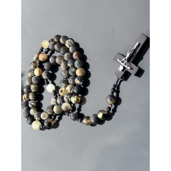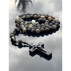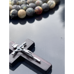 Centralnym elementem różańca jest elegancki krzyżyk wykonany z hebanu tygrysiego (wymiary około 4,5 cm x 3 cm, czyli 1,77 cala x 1,18 cala), ozdobiony srebrnym (Ag 925) krzyżykiem Jana Pawła II, co czyni go wyjątkowym symbolem wiary i oddania.