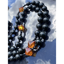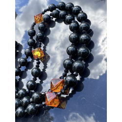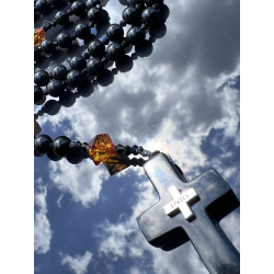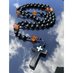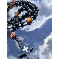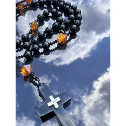 Ten wyjątkowy różaniec „Black Amber” to połączenie piękna natury i duchowej głębi modlitwy różańcowej. Wykonany ręcznie z naturalnego prasowanego bursztynu bałtyckiego w kolorze głębokiej czerni, zachwyca szlachetnym wyglądem i głęboką symboliką. Koraliki o średnicy 8 mm (0,31 cala) tworzą główny sznur różańca, a jego „dziesiątki” wykonane są z nieprasowanego bursztynu bałtyckiego w odcieniu koniakowym – fasetowane w formie szlifu diamentowego, o wielkości od 8 do 12 mm (0,31–0,47 cala).