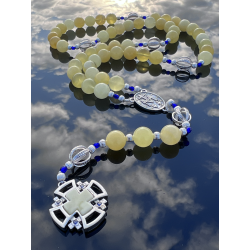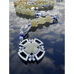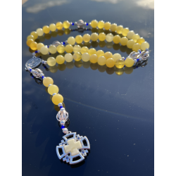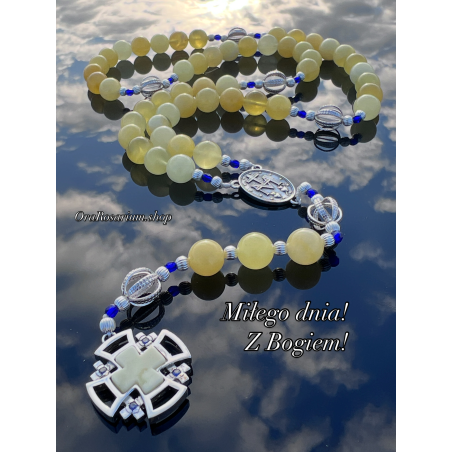 Ręcznie wykonany różaniec z naturalnych, szlachetnych materiałów.