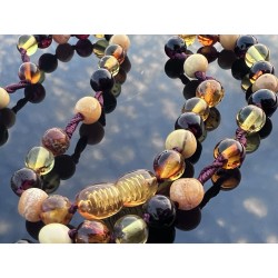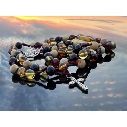 Ciepła barwa bursztynu — od złocistych tonów po głębsze, miodowe odcienie — nadaje różańcowi naturalne piękno i spokojny charakter. Każdy koralik jest inny, nosi w sobie własną historię i strukturę.
