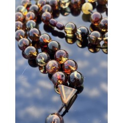 Polerowana powierzchnia bursztynu wydobywa jego naturalne piękno — od jasnych, złocistych tonów po głębokie, koniakowe odcienie. Światło delikatnie odbija się od koralików, podkreślając ich szlachetność i unikalną strukturę.