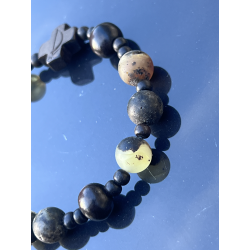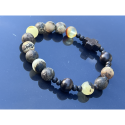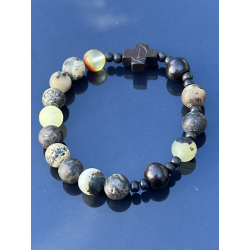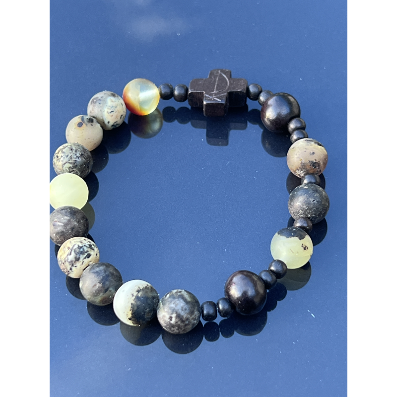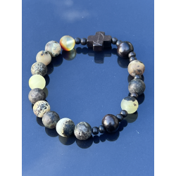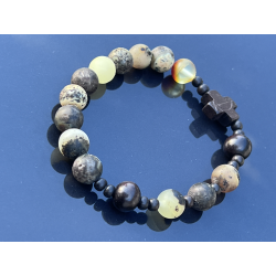 Naturalny bursztyn bałtycki słynie z właściwości prozdrowotnych – zawiera kwas bursztynowy, który wspiera układ odpornościowy, redukuje stres i pomaga w osiągnięciu równowagi energetycznej. Połączenie bursztynu z modlitwą różańcową nadaje bransoletce mistyczny wymiar, pomagając w skupieniu, pogłębieniu wiary i odnalezieniu duchowego spokoju.