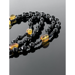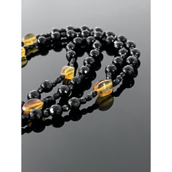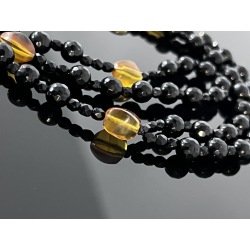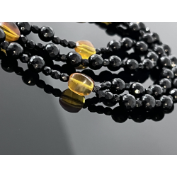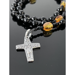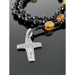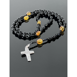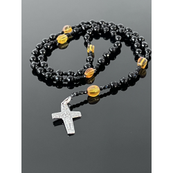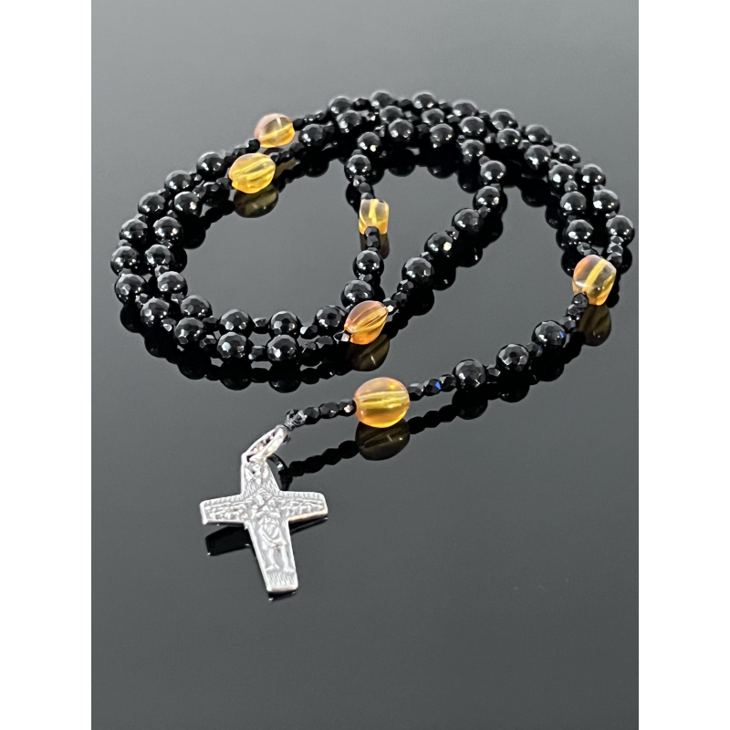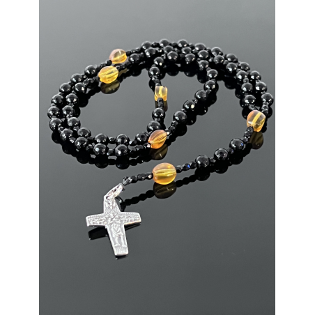 Piękny różaniec zaprojektowany specjalnie na okazję Pierwszej Komunii Świętej. Wykonany z eleganckiego czarnego onyksu o fasetowanej powierzchni (korale 6 mm), który symbolizuje siłę i ochronę duchową. „Dziesiątki” różańca zdobią koraliki z naturalnego bursztynu w ciepłych, żółto-pomarańczowych odcieniach, nawiązujące do światła Bożej łaski.