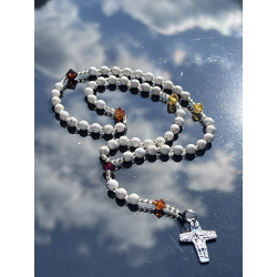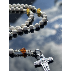 Korale z białego kamienia naturalnego (6 mm / 0,24 cala) tworzą subtelną i harmonijną bazę, a dziesiątki wykonane z naturalnego bursztynu bałtyckiego w kształcie diamentów (ok. 6-8 mm / 0,24-0,31 cala) dodają ciepła i unikalnego charakteru. Całość dopełnia srebrny krzyżyk Ag925 Dobry Pasterz, który symbolizuje troskę i miłość Chrystusa.