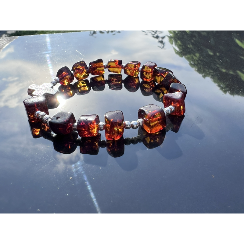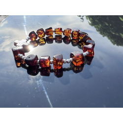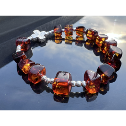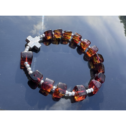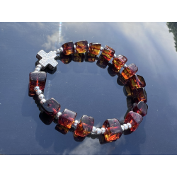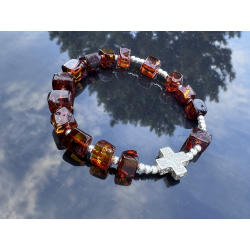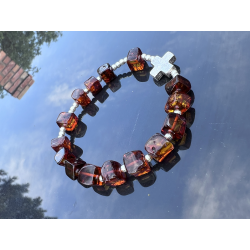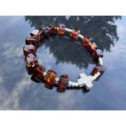 Bransoletka-różaniec na rękę wykonana ręcznie w Polsce z naturalnego bursztynu bałtyckiego i srebra próby 925. Koraliki bursztynowe o średnicy ok. 7–10 mm przeplatają się z delikatnymi srebrnymi kulkami (3 mm), a całość dopełnia krzyżyk ze srebra o wymiarach ok. 10 × 10 mm. Bransoletka nawleczona jest na trwałą i elastyczną jubilerską gumkę silikonową, co zapewnia komfort noszenia i łatwość zakładania.