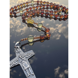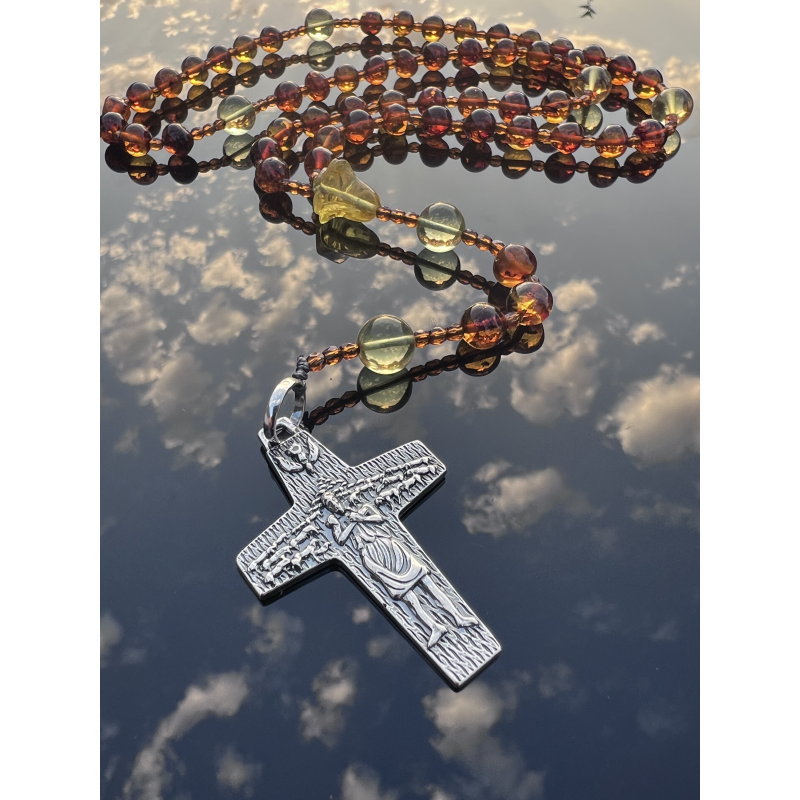 Koraliki z naturalnego bursztynu bałtyckiego o ciepłym, koniakowym blasku (ok. 8 mm) symbolizują światło i ciepło Bożej obecności, a „dziesiątki” z bursztynu lubelskiego w barwie cytrynowego światła (ok. 10 mm) przypominają o nadziei i radości płynącej z wiary.