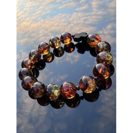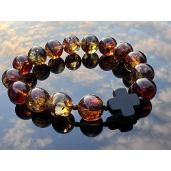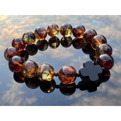 Piękny różaniec w formie bransoletki, wykonany z naturalnego bursztynu bałtyckiego o dużych, szlachetnych koralach (ok. 13 mm). Dostępny w rozmiarze męskim (ok. 20 cm) oraz damskim - dziesiątka (ok. 17/18 cm). Całość dopełnia elegancki krzyżyk z drewna hebanu tygrysiego, który nadaje całości wyjątkowego charakteru.