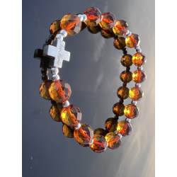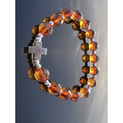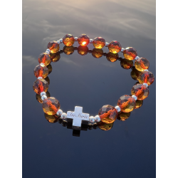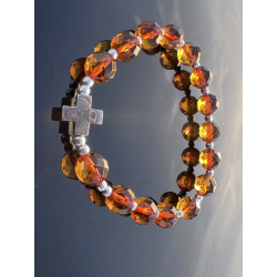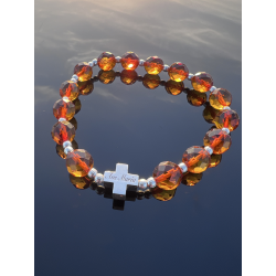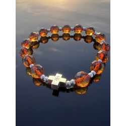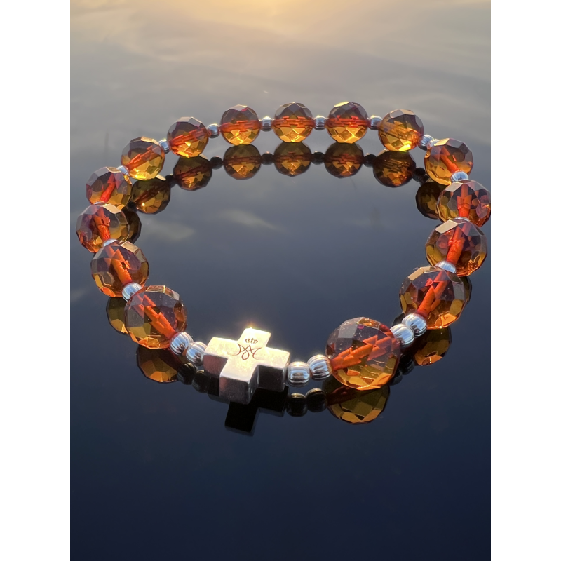 Fasetowane koraliki bursztynowe o średnicy ok. 8–9 mm, przeplatane srebrnymi kulkami, tworzą harmonijną całość zakończoną delikatnym krzyżykiem (10 × 10 mm) – symbolem zwycięstwa światła nad ciemnością. Elastyczna jubilerska gumka zapewnia komfort noszenia, a rozmiar można dopasować do nadgarstka (16–22 cm).