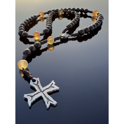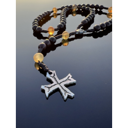 Bursztyn bałtycki – naturalny, matowy, nienootowany, o wymiarach 8–10 mm, dodający całości ciepła i sakralnego blasku.
