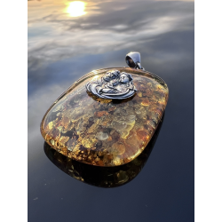 Medalion ma wyjątkową, szlachetną formę — bursztyn o dużej powierzchni pięknie odbija światło, podkreślając srebrny wizerunek Świętej Rodziny.